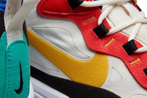 Celebrating 100 years of the iconic Bauhaus movement, the lead palette of the first Nike Air Max 270 React drop is inspired by the famous German art school. No-sew uppers create a sleek, streamlined look in a bright, beautiful Bauhaus mix of university red, yellow gold, royal blue and peacock. The slick glossy Air unit is finished in deep electric blue while the sleek white toebox is tipped in pitch black overlays for a high-contrast finish and a fitting tribute to an iconic moment in modernist design.