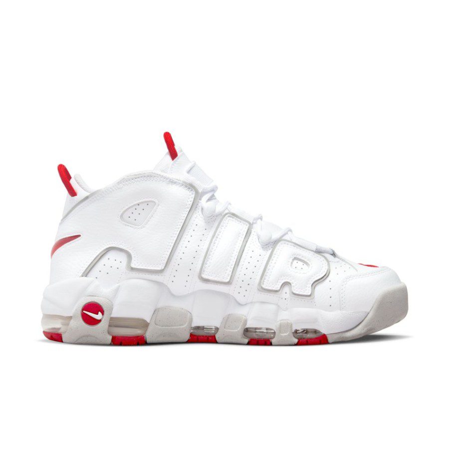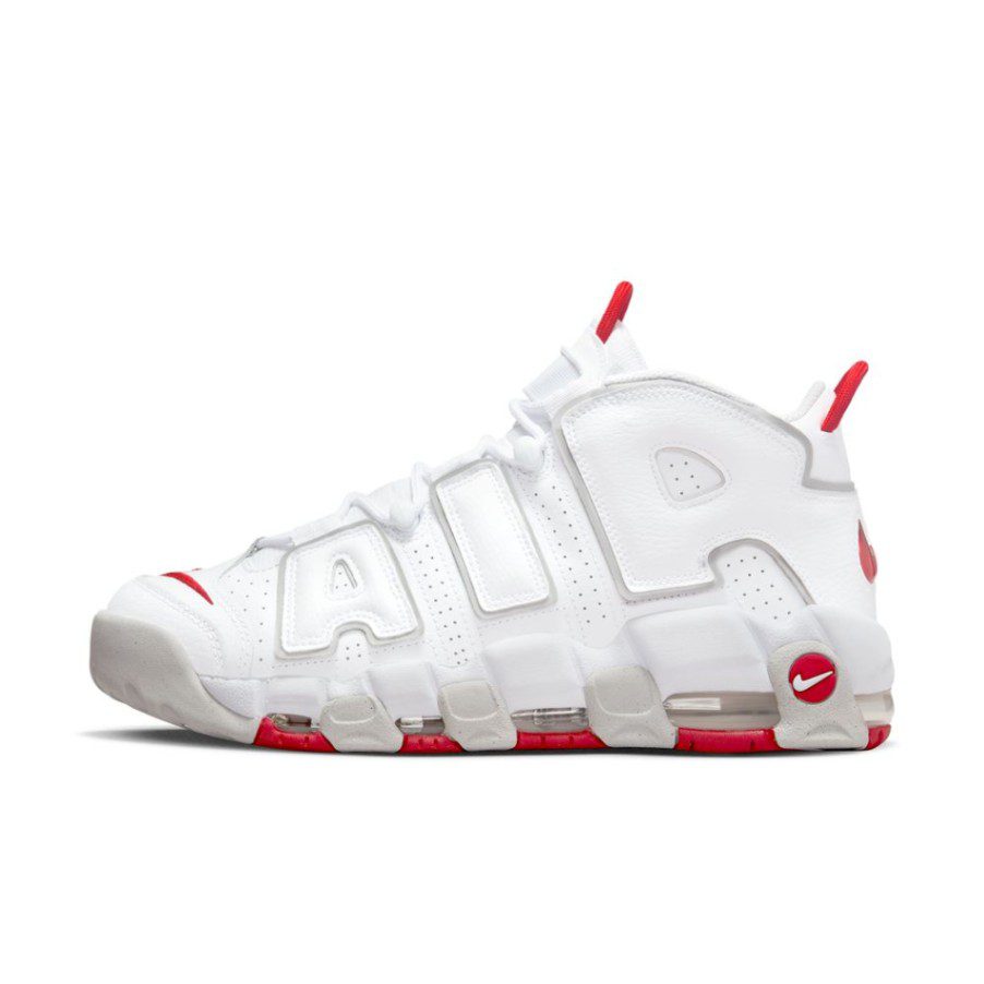 NIKE AIR MORE UPTEMPO ’96 סניקרס לגברים בסיס משולב בסוליית גומי חיצונית . כיתוב בצידי הנעל. יחידות נראות לעין בסוליה.