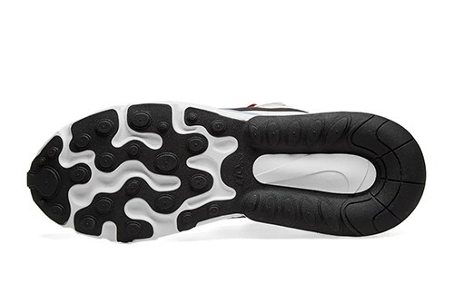 נעלי נייק Nike מדגם Air Max 270 React עם סוליית גומי יחודית בשילוב יחידת אוויר ובולם לריכוך הצעדים. לנעליים בד רשת לאוורור, שרוכי קשירה ולוגו נייקי מופיע על צידי הנעל ומאחור.